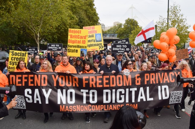 Protesters pass through Victoria Embankment during a march against government plans to introduce a digital ID (Picture: Vuk Valcic/ZUMA Press Wire/Shutterstock)