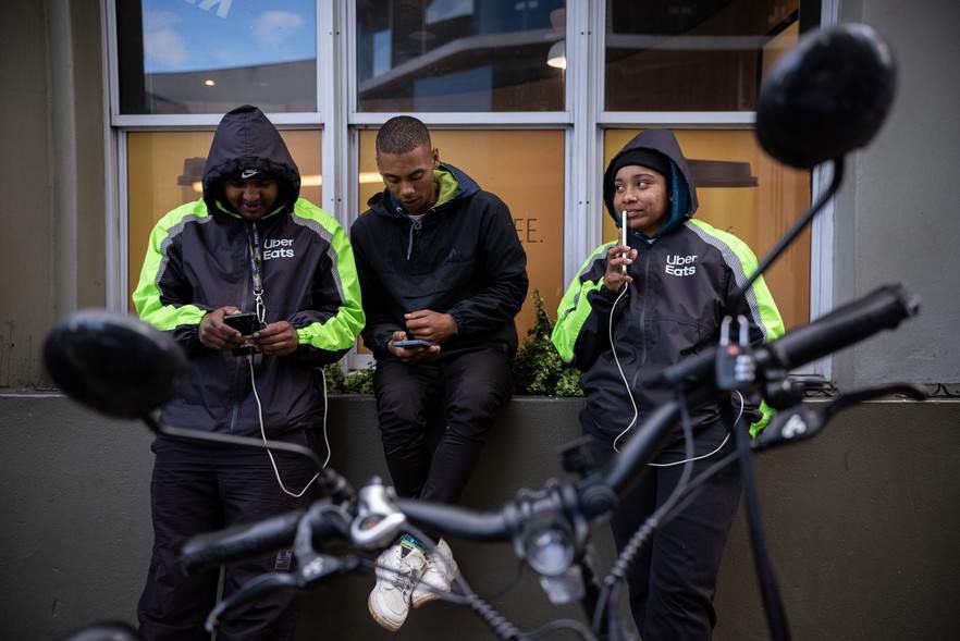 Waiting for orders to come through on the Uber Eats App,Pitcher and her colleague Kyle Abels sit outside Cavendish Square on a Saturday afternoon.