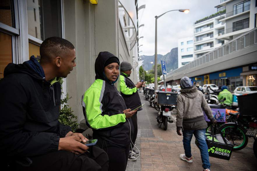 Pitcher (right) gears up to make the 10km ride back to her home in Manenberg after a long day of making deliveries for Uber Eats in the Claremont area.