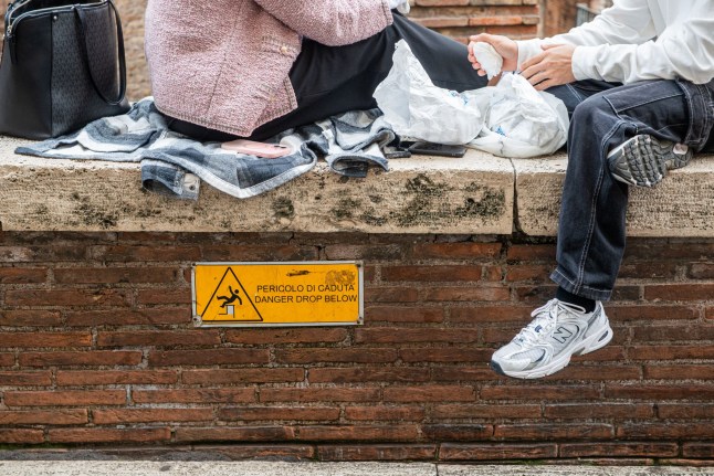 Tourists sitting on the wall around the church’s moat,as a sign warns of the drop below (Picture: LaPresse/Shutterstock)