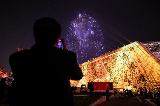 An image created by drones depicting the funerary mask of Tutankhamun lights up the sky above the Grand Egyptian Museum during the opening ceremony in Giza (Picture: EPA)