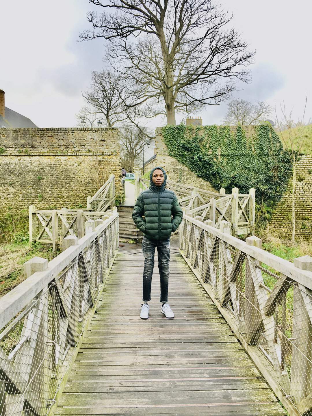 Sphelele walking around the town of Lannion on his prosthetics provided by Jumping Kids SA.