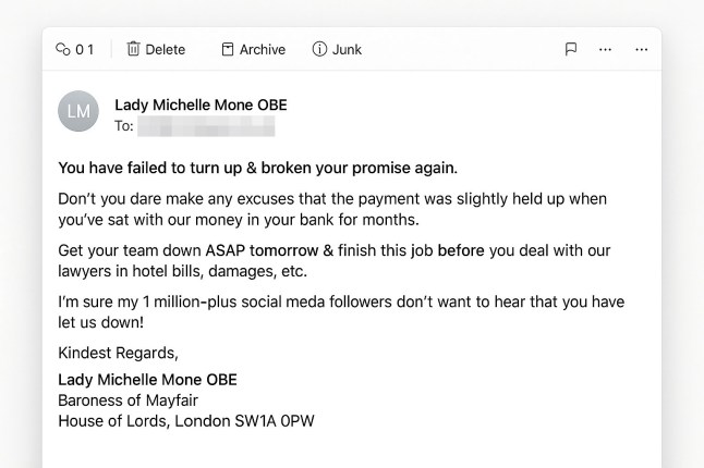 But the glazier claimed ‘To her,I was just something she trod in’ and showed the paper emails with the sign-off ‘Kindest Regards,Lady Michelle Mone OBE,Baroness of Mayfair,House of Lords,London SW1A 0PW’.