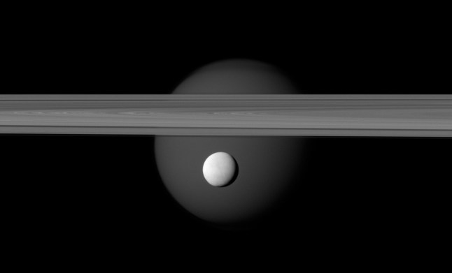 Enceladus is stuck in a gravitational tug of war between Saturn and another moon,Dione (Picture: Getty Images/Science Photo Libra)