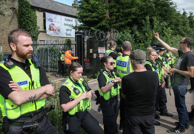 Police officers guard MBR Acres,a facility breeding beagle puppies for animal testing,in Huntingdon,June 2024 (Picture: Pope/SOPA Images/Shutterstock)