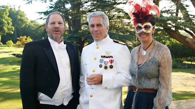 Jeffrey Epstein (centre) pictured at the Royal Lodge with masked Ghislaine Maxwell,and Harvey Weinstein (Picture: The Sun/News Licensing)