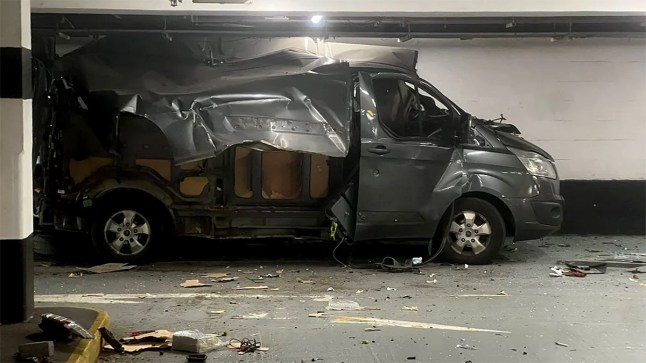Photographs shared on Reddit from the scene show a mangled grey van inside the car park. The back doors have been blown open,and debris,including scraps of a taillight and a candle lighter,can be seen.