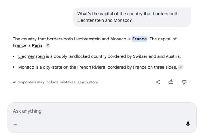 It replied: ‘The country that borders both Liechtenstein and Monaco is France. The capital of France is Paris.’