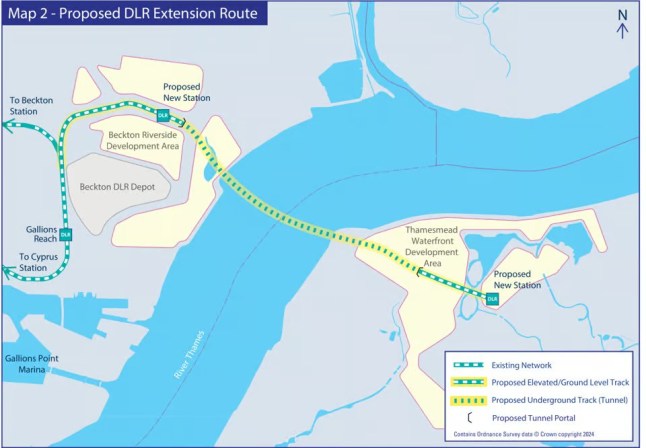 The plan is to extend the line from Gallions Reach station,build a new station in the Beckton Riverside area,and a new tunnel under the river connecting to another new station in Thamesmead.