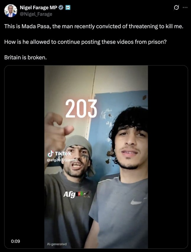 Fayaz Khan was sentenced to five years in prison and also another eight months for arriving in Britain illegally (Picture: Metropolitan Police/PA Wire)Reposting the video,Mr Farage said: ‘This is Mada Pasa,the man recently convicted of threatening to kill me.‘How is he allowed to continue posting these videos from prison? Britain is broken.’When Khan made the first threats against Mr Farage,he was responding to a video made by Farage on October 12 last year,in which he highlighted Khan and referenced ‘young males of fighting age coming into our country about whom we know very little’.But Khan responded with a video two days later,saying: ‘Englishman Nigel,don’t talk shit about me.‘You not know me. I come to England because I want to marry with your sister. You not know me.‘Don’t talk about me more. Delete the video. I’m coming to England. I’m going to pop,pop,pop.’Prosecutor Peter Ratliff said Khan made ‘gun gestures with his hand’ and was pointing to an AK-47 tattoo on his face to ‘emphasise he wasn’t joking’.Jurors were shown a screenshot of a subsequent TikTok post by Khan with the caption ‘I mean what I say’ written on an image of a GB News report about the alleged threat against Farage.In a police interview on November 1 last year,Khan said: ‘It was never my intention to kill him or anything – this is my character,this is how I act in my videos.’The Afghan national added: ‘In every video I make those sounds,I say “pop,pop pop”.’Mr Ratliff said: ‘If you’ve got an AK-47 tattooed on your arm and your face,it’s because you love AK-47s and you want the world to know that.’United News - unews.co.za