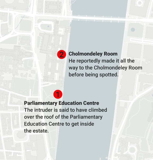 It is said the intruder got into the estate by climbing over the roof of the Parliamentary Education Centre at the southern end of the palace.