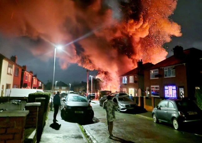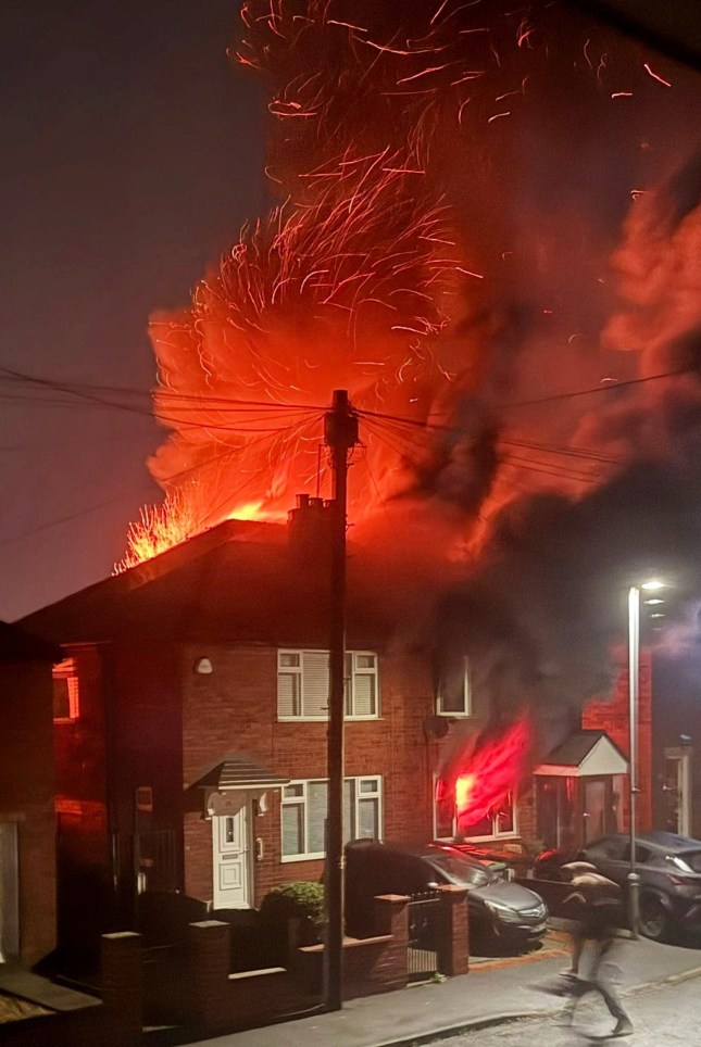 Dramatic images show huge plumes of black smoke,red sparks and flames rising from the house.