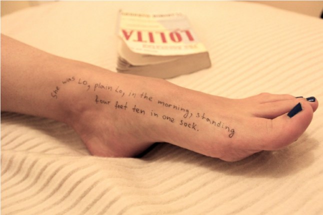 Images released yesterday show close-ups of sentences from ‘Lolita’,a book about a man’s obsession with a 12-year-old girl,scribbled across a female’s body — chest,foot,neck and back.