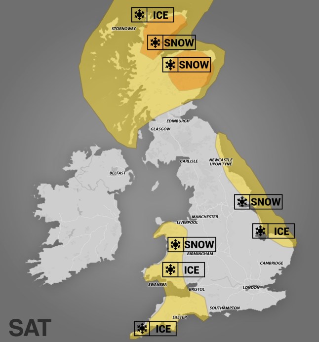 UK weather warnings for snow and ice are in place across Scotland,Northern Ireland,parts of Wales and some of England (Picture: Metro Graphics)The Met Office has issued warnings about power cuts,stranded vehicles and communities being cut off.Amber weather warnings for snow are in place on Saturday for Shetland and some parts of Scotland,covering Inverness and Aberdeen.Those amber alerts are expected to remain in place until midday on Saturday,while the yellow weather warnings for snow and ice are in place for most of northern Scotland.Meanwhile,yellow alerts for snow and ice are in place for much ofNorthern Ireland,including Belfast,Londonderry and Donegal.A stretch of eastern England from Newcastle upon Tyne down to Middlesbrough,Scarborough and as far south as Norwich,Norfolk,has been issued with a yellow alert.