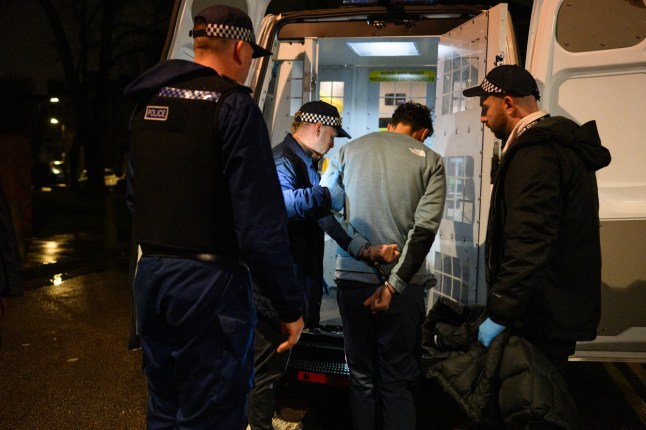 One man is seen being led away from the scene after the raid last Friday (Picture: Justin Griffiths Williams/Metro)