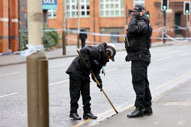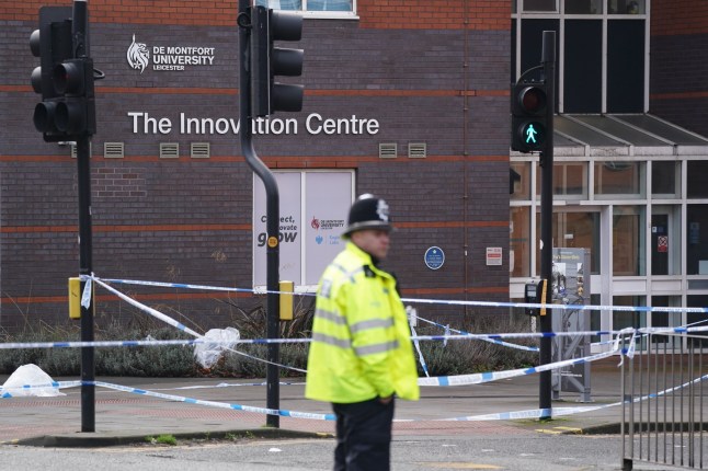 Police at the scene by De Montford University’s Innovation Centre (Picture: Jacob King/PA Wire)