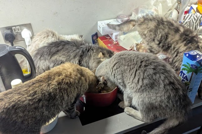 Cats were left to eat food from the same bowl on a kitchen counter (Picture: RSPCA)
