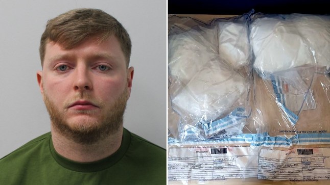 Samuel De Vere-Hunt (left) was caught with hundreds of kilos of drugs (right) as he left his home (Picture: Met Police)