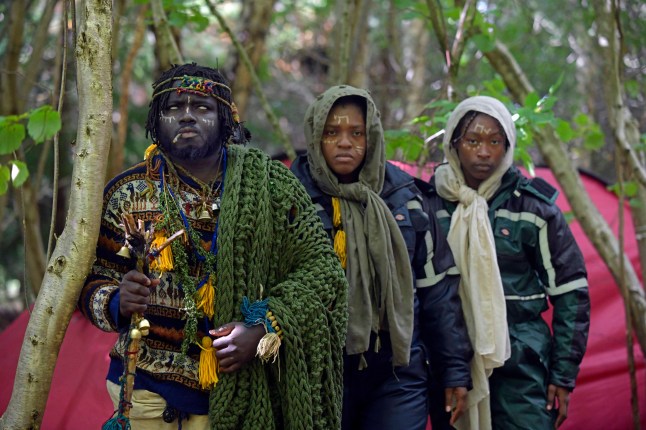 Kofi Offeh aka ‘King Atehene’ is one of three self-styled ‘African tribe’ members camping in woods near Jedburgh (Picture: Barlow/PA Wire)