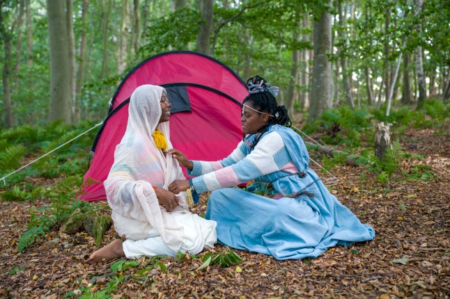 Queen Nandi’ (right) and handmaiden ‘Asnat’ (left) at their campsite in woods near Jedburgh