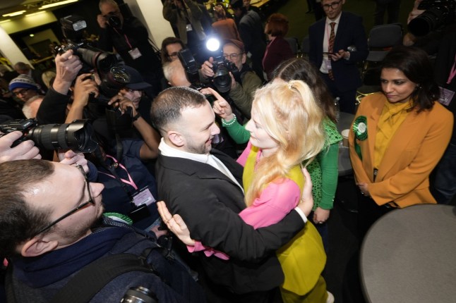 New Green Party MP Hannah Spencer embracing party leader Zack Polanski after her victory (Picture: Peter Byrne/PA Wire)