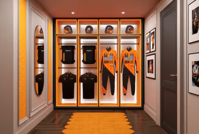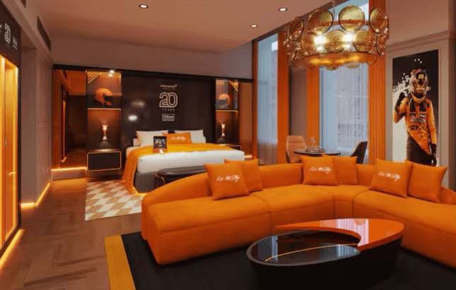 The suite opens with a bold papaya-orange door. The iconic McLaren shade,this colour scheme continues throughout.