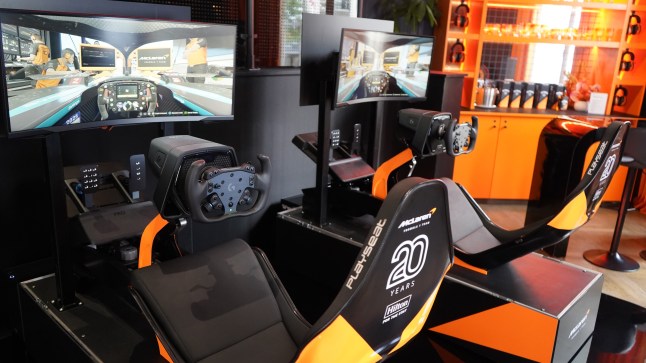 Think: a full bar (more on that later),bean bag-style F1 tyres,a pit wall media setup with four screens showing race highlights,interviews,and live race-day content. But best of all,your very own top-tier McLaren F1 racing simulators.