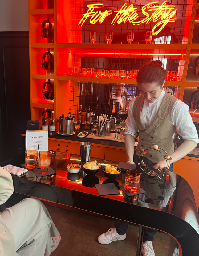 This wasn’t just a minibar,it rivalled actual hotel bars I’ve visited. Included in the price was a private happy hour called ‘Garage Hour’ where a mixologist came to the suite to shake up custom F1 cocktails in race-themed glassware,complete with bar snacks.