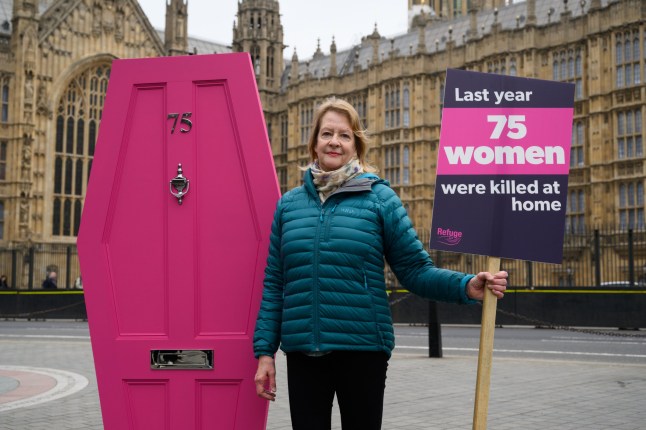 Organised by charity Refuge,the demonstration centred on a single bright pink front door,chillingly coffin-shaped and emblazoned with a metallic ’75’.