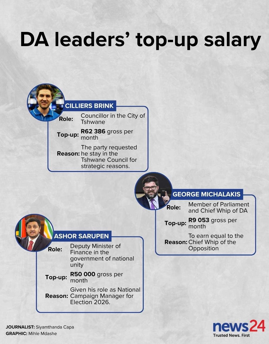 According to the December 2025 report,DA councillor and Tshwane mayoral candidate Cilliers Brink received the largest top-up of R62 386 per month.