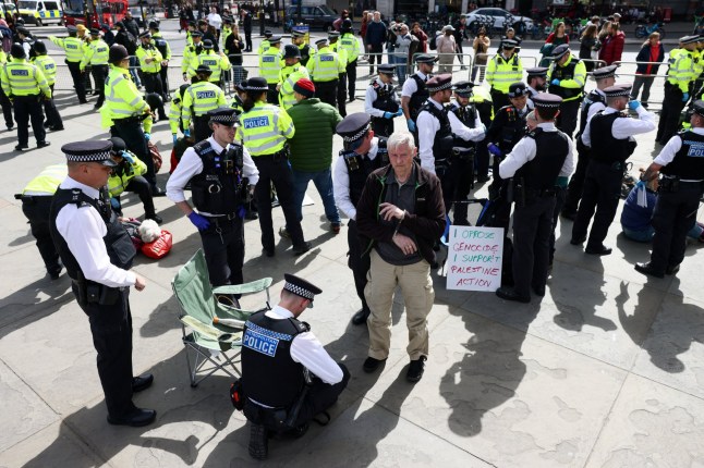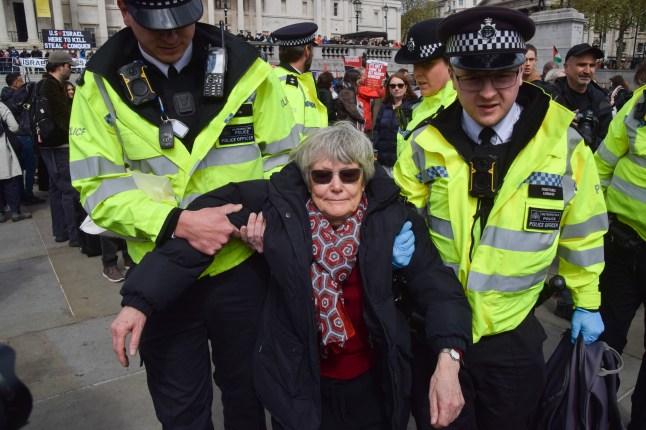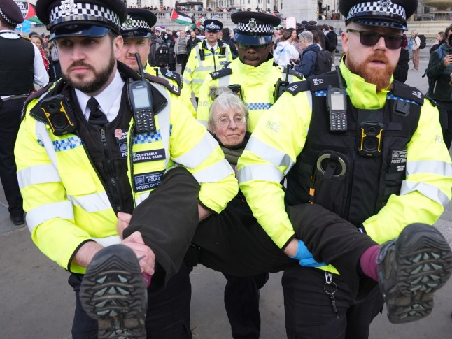 Police officers arrest an elderly protester in Trafalgar Square during a demonstration in support of the activist group Palestine Action (Picture: ZUMA Press Wire/Shutterstock)