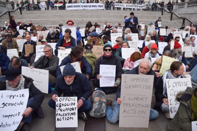 Supporters sit with ‘I oppose genocide,I support Palestine Action’ placards in Trafalgar Square (Picture: ZUMA Press Wire/Shutterstock)