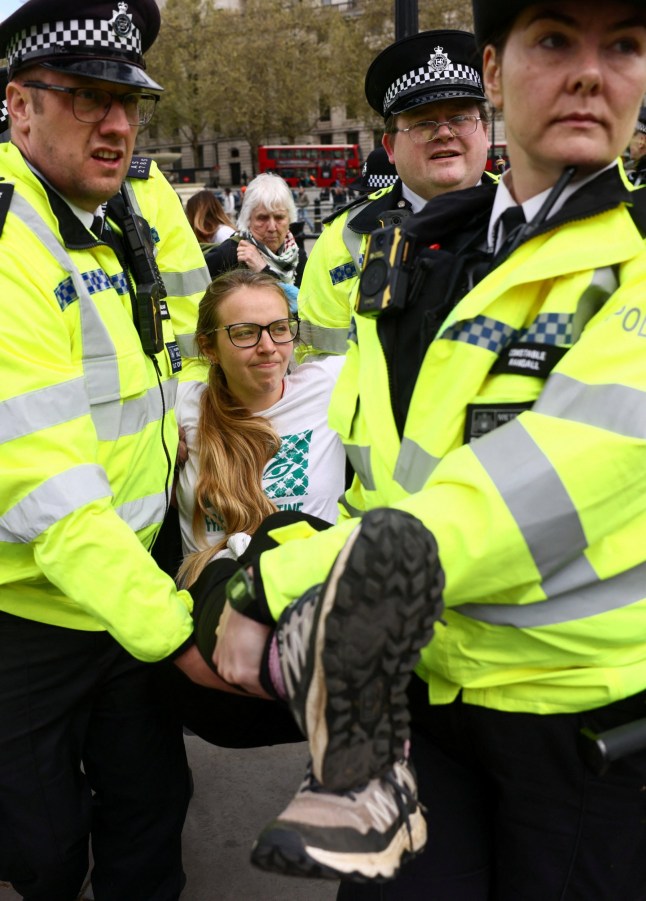 Police officers detain a protester at an event in Trafalgar Square organised by Defend Our Juries (Picture: Reuters)