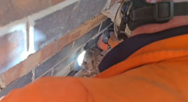 A little cub emerges from the wall after being trapped between two buildings (Picture: Leicestershire Fire Brigade/Cover Media)