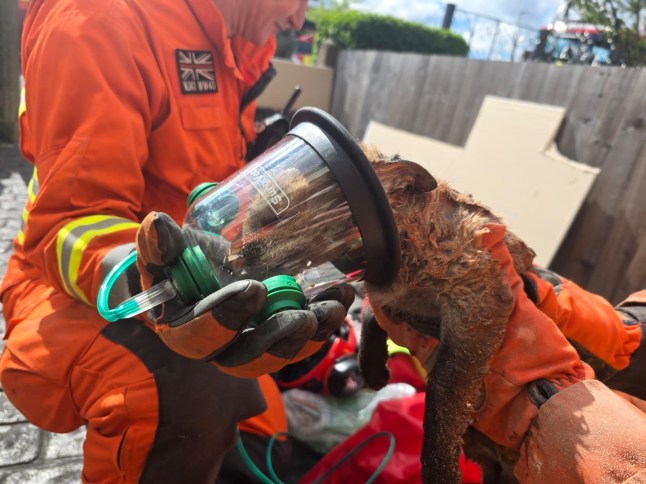 A fox cub receives oxygen after being pulled free (Picture: Leicestershire Fire Brigade/Cover Media)